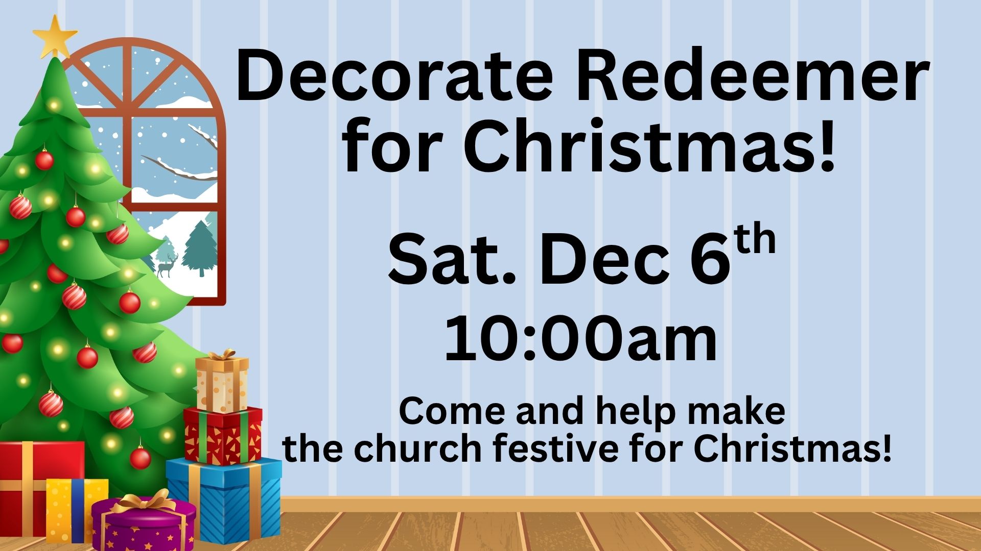 On Sat. Dec. 6th at 10:00am help decorate the church for the upcoming Christmas season. Mark your calendars and help make the church festive for this Christmas season. Questions? Please email BJ.