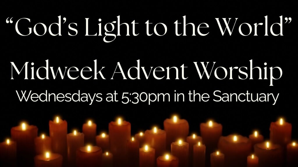 ADVENT MIDWEEK WORSHIP: During this busy Advent season, take a moment to reflect on this special season of light by worshiping with us on Wednesdays at 5:30pm. Our theme is “God’s Light to the World” and is based upon Luke 2:25-32. The Evening Prayer Service begins today at 5:30pm in the Sanctuary.