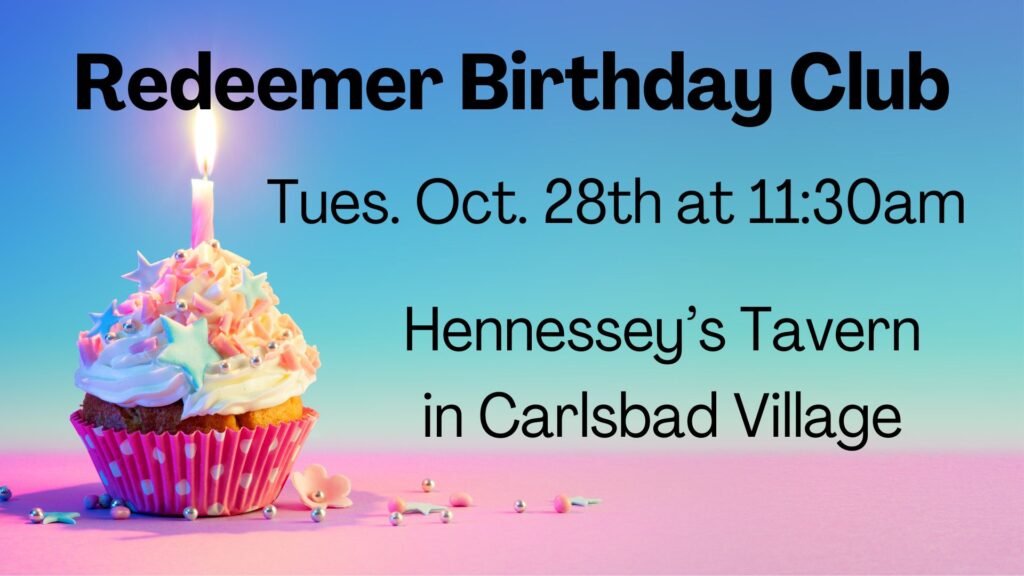 REDEEMER BIRTHDAY CLUB: We will meet Tuesday, October 28th at 11:30am at Hennesey’s Tavern in The Village. All are welcome! We will be celebrating July, August and September birthdays. Please RSVP Here so we can make a reservation.