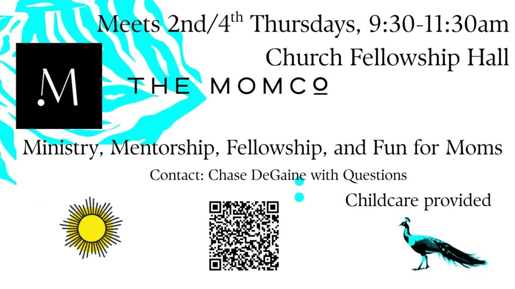 MOMCO is where Christian Moms come together to tackle motherhood, family and chaos management. Our Fall Kickoff is underway. The next session will be on Thurs. Oct. 9th at 9:30am. Email Chase De Gaine for more information.