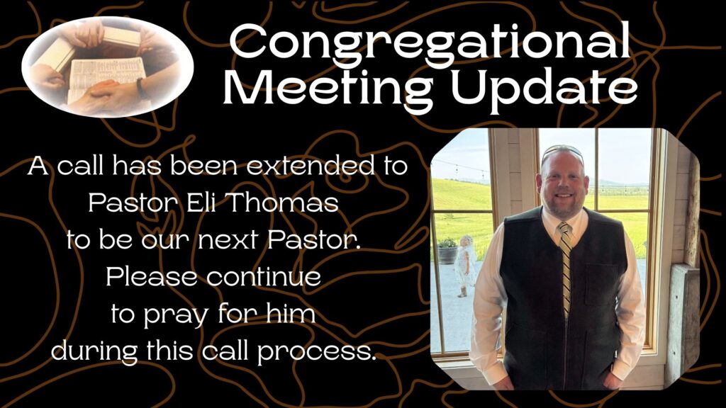 We’re pleased to announce that the congregation unanimously voted to extend a call to Pastor Eli Thomas to be our next Pastor. The call package has been sent to Pastor Thomas and he will have time to prayerfully deliberate about what God is directing him to do. It is not uncommon for Pastors to take 30-45 days to consider a call. In the meantime, please pray for Pastor Thomas, his wife Jennifer, their children and his congregations. We trust in the Lord and in the Call Process, and we know that God in His mercy is our great provider.