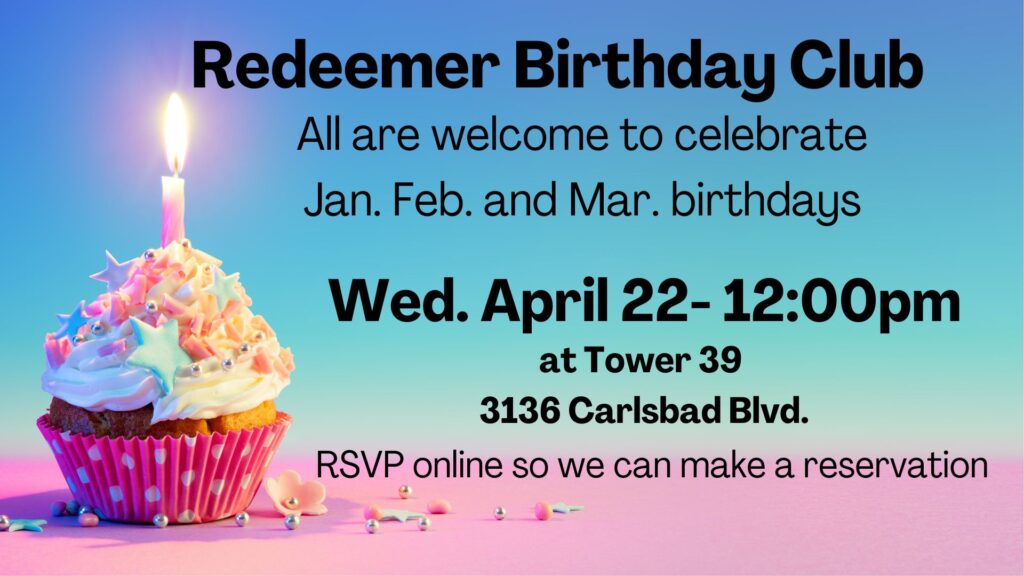 Redeemer Birthday Club will meet at noon on Wednesday, April 22nd at Tower 39: 3136 Carlsbad Blvd. The restaurant is on the top of the Springhill Suites Hotel. There is a separate elevator out in the parking lot across from the lobby to take you to the rooftop restaurant.