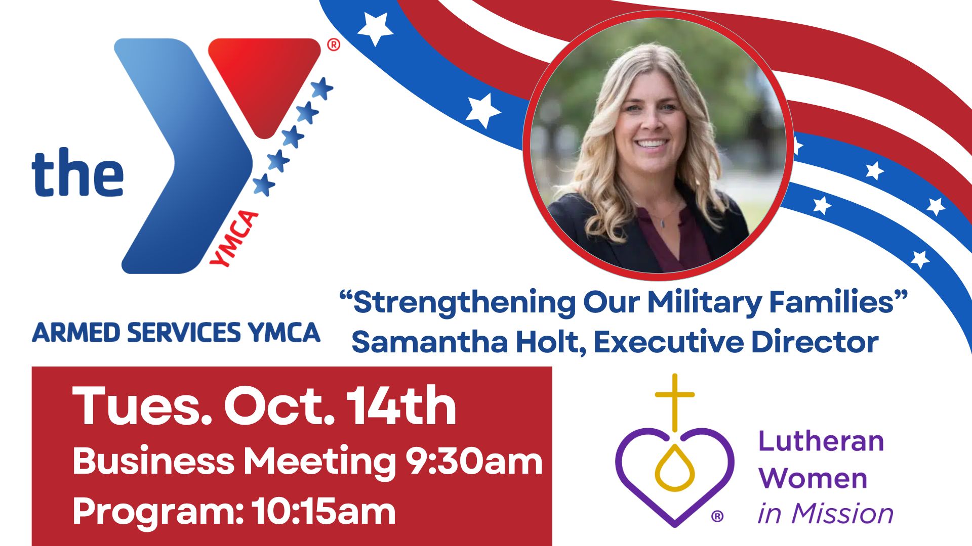 LWM MEETING AND PROGRAM ON OCT. 14TH: The next business meeting for Lutheran Women in Mission (LWM) will be on Tues. Oct. 14th at 9:30am. Then at 10:15am, our speaker will be Samantha Holt, Executive Director of The Armed Services YMCA Camp Pendleton. The YMCA’s programs empower young people, improve health and well-being, and provide support, and inspire action in our communities. This program looks to be quite informative. All are welcome to come find out more.