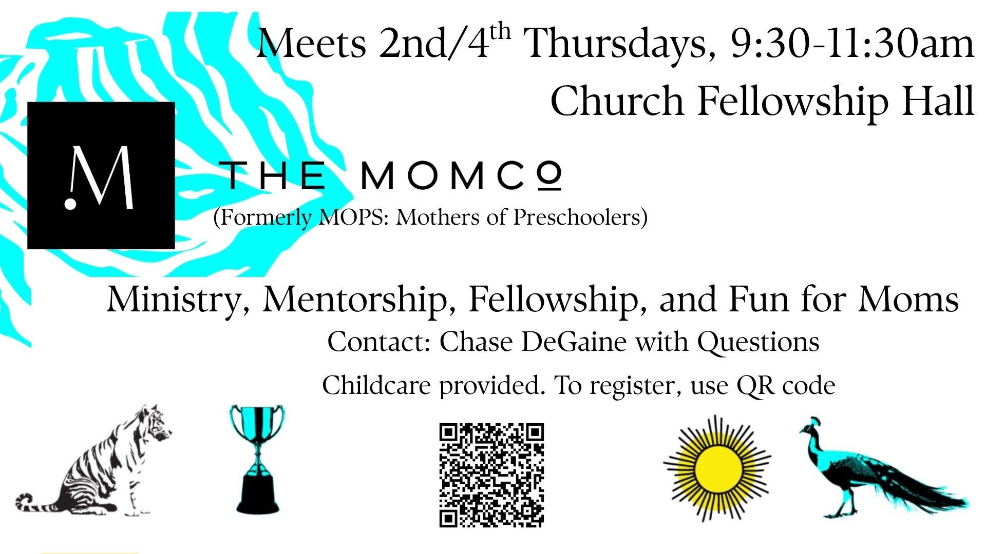 MOMCO is where Christian Moms come together to tackle motherhood, family and chaos management. Our Fall Kickoff is underway. The next session will be on Thurs. Oct. 9th at 9:30am. Email Chase De Gaine for more information.